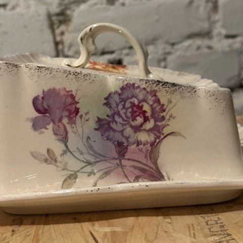 Vakker antikk todelt osteklokke / smørfat i porselen, av Franz Anton Mehlem fra Bonn, Tyskland. En fabrikk med en historie helt tilbake til 1755, og som ble oppkjøpt av Villeroy & Boch 1. juni 1920. Fabrikken ble stengt i 1931, og revet stykkvis og delt fra 1933 til 1938.