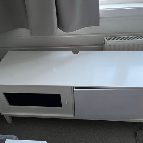 Pent brukt TV og stereobenk. 3 rom/hyller til utstyr. (Mangler noen knotter til hylleoppheng, men de kan man lett få tak i). Man kan justere/ta av hyllene som man ønsker. I tillegg to rom på sidene med plass til 29 DVD-er/CD-er på hver side. Altså totalt 58 plasser. På dybdesidene er det også lagringsrom på hver side. Det følger med fire hyller man kan sette på her (se bildene). Topphylla gjør at TV-en kan snus, men det mangler en bit/dings slik at hylla må justeres med "egen kraft". Man kan også velge å ikke bruke topphylla i det hele tatt.