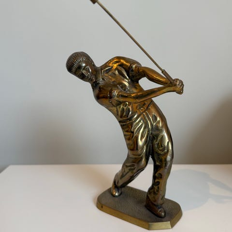 The Winning Shot skulptur som viser tre figurer med golfutstyr, inkludert golfkølle og golfball. Figuren er detaljert med fargerike klær og hatt, satt på en rund base med teksten "The Winning Shot". Passer til dekorasjon eller samling med golfrelaterte gjenstander.