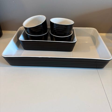 Pent brukte, avlange ildfaste former, den ene med lokk. Selges samlet for 250 kr eller hver for seg for 150 kr. De bør hentes, men kan sendes om kjøper betaler emballasje og porto.