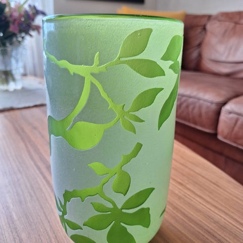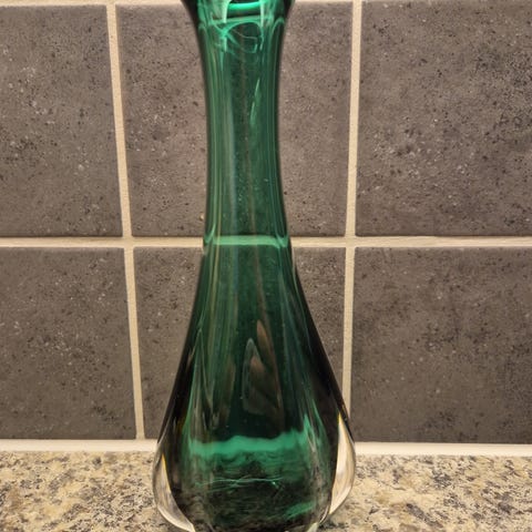 Pent brukt vase av eldre type. 20,5 cm høy. Må hentes.