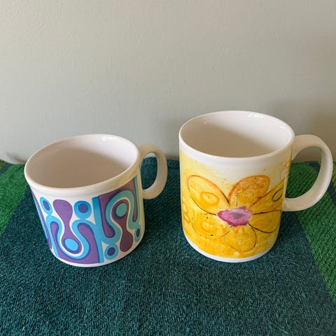 To pent brukte, enkle krus med blomstermotiv. Selges samlet. Bør hentes.