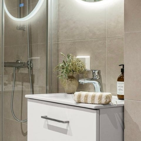 Pent brukt baderomsinnredning fra 2024, dobbel servant 120 cm og speilskap