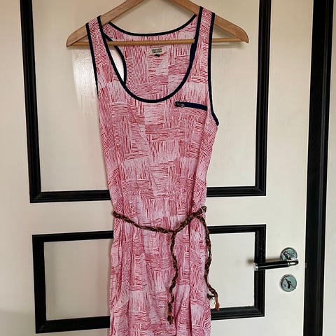 Kul playsuit fra H&M sin studiokolleksjon. Burgunderfarget med hvite striper og knyting i livet. Størrelse small, men vil si mer en medium, men avhenger av hvor løst man ønsker at den skal sitte. Prislapp fjernet, men har aldri vært brukt. Hentes i Fredrikstad eller kan sendes mot at kjøper betaler frakt.