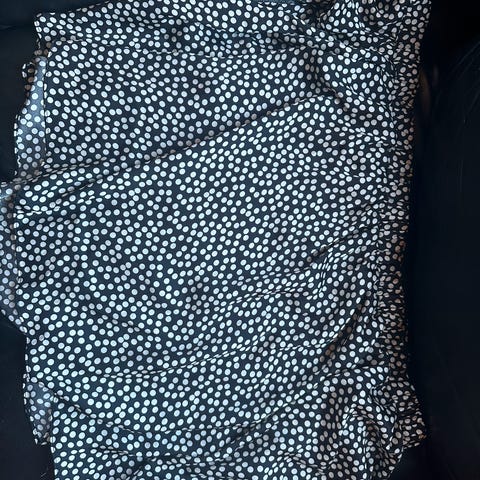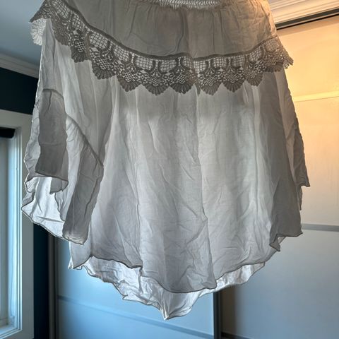 Supersøt blusetopp med off-shoulder-look. Toppen er helt ny med lapper, og er størrelse L. Materiale: 68% bomull, 28% polyamid, 4% elastan, Jeg sender stort sett alltid første virkedag etter mottatt penger for frakt :)