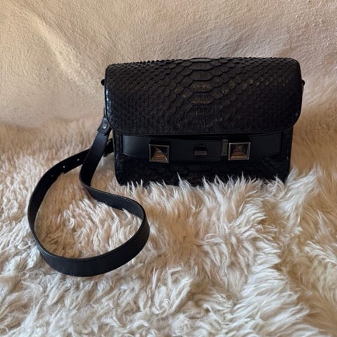Jeg vurderer å selge min Proenza Shouler PS11 Classic Saddle. Kjøpt på Hollygolightly i København for noen år siden. Den er lite og svært pent brukt. Noen små merker, se bilder.