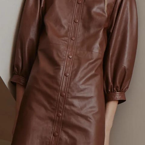 Turnover, brun kjole med skinndetaljer, ikke brukt, kun hengt i skapet, selges til halvpris