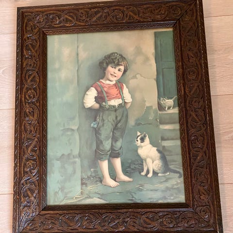 Tre små trykk med motiv av barn selges for 300 kr. Et av bildene har noen fuktskader på passepartouten. Jeg kan ikke finne noen signatur.