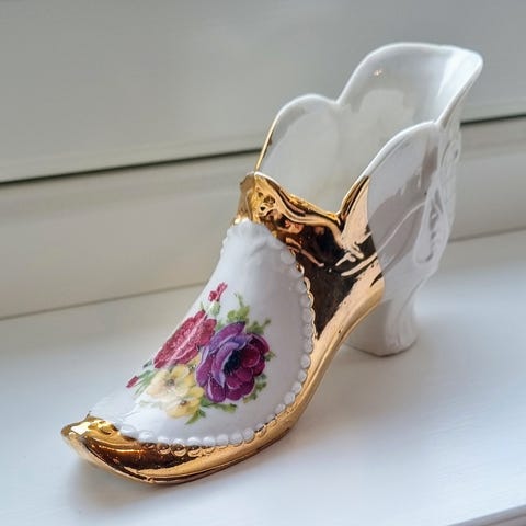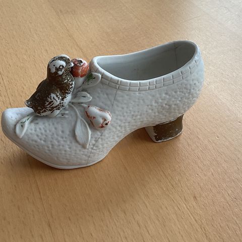 SØTE håndmalte, portugisiske SKO i PORSELEN. Skoene er håndmalte i Portugal. De høyhælte skoene er ca. 12 cm lange og treskoene ca. 10 cm lange.