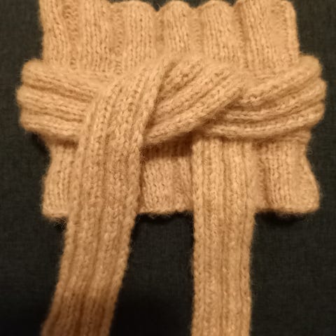 Har ett strikka rosa skjerf . Blir ikke brukt .Det er litt skadet .mulig det må inn med en ekstra strå.