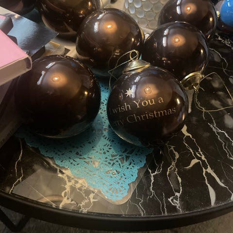- 4 stk plastkuler med Drink Me tekst som kan for eks henges på juletre. (Disse har vært fylt med akevitt tidligere)
