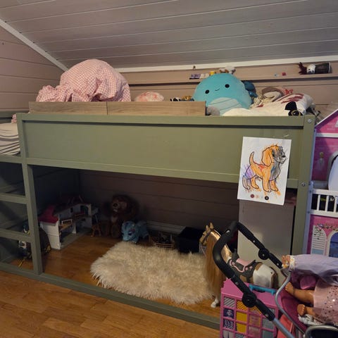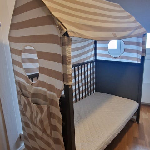 Leveres med to madrass-størrelser, stang til himmelseng, to himmler: en rosa og en blå. Ny pris kr 13000. Samme farge som på bildene.