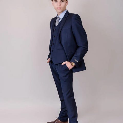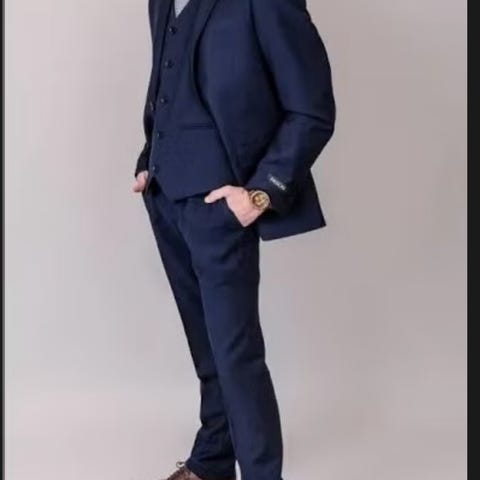 Pen blå dress som består av bukse, jakke og vest. Nydelig blåfarge. Fin, smal passform. Slimfit. Flott kvalitet.