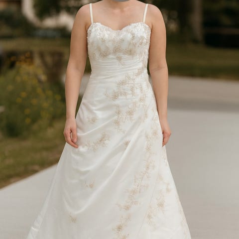 Selger min nydelige brudekjole, Romantica -Libby, kjøpt våren 2017 på Solgunns Salong. Brukt kun 1 gang, ingen skader. 2 kjoler i 1; tynt lag over i blonde, som kan tas av. Enkel satengkjole under med sweatheart form foran. Str. 42/44. Ønskes solgt for 7000,- (nypris 19500,-). Pris kan diskuteres. Kan prøves i Oslo eller Elverum.