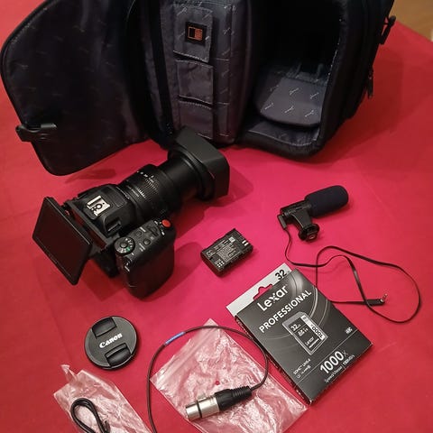Canon XA10 med håndtak og 2 XLR innganger og plass til mikrofon.
