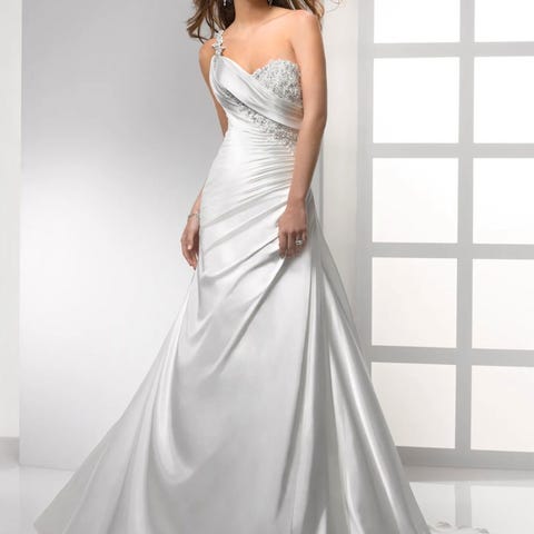 Selger min nydelige brudekjole fra Maggie-sottero svært billig! Jeg kjøpte denne ny på Belle Amie i Bergen sentrum for ca 19000,-. Brukt den en gang og renset den på profesjonelt renseri. Kjolen er like fin som ny. Jeg er 168 cm høy og brukte ca 5 cm hel. Underskjørt følger ikke med. kjolen kan knytes opp slik at det blir lettere å danse