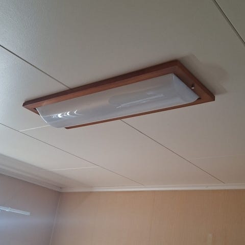 01 stk kjøkken lysarmatur i tre 2 x 18w hver 66 x 22 x 08cm pent brukt, kan males i ønsket farge.