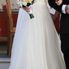 Unik og vakker brudekjole selges. Vakkert korsett med mange detaljer. Størrelsen kan justeres med snøring i rygg, 36-42. (?) Skjørtet er stort, og trenger en ekstra piff med ett godt underskjørt. (Dette lånte jeg, derfor har jeg ikke det til salgs)