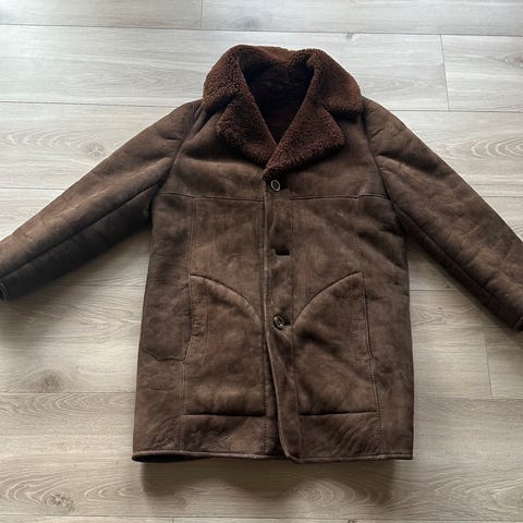 Flott og ekte shearlingjakke i semsket saueskinn og tykt fôret. Meget stilren, varm og behagelig. Jakken er laget hos skredder og kun brukt et par ganger. Jakken fremstår som ny. Passer perfekt til person på 170-180 cm. En trendy jakke i topp kvalitet som vil holde seg i mange, mange år.