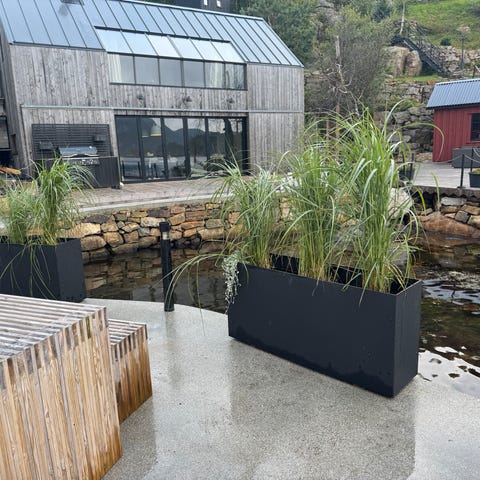 På de sorte plantekassene i fiberstein kan man etter en stund enkelt friske opp fargen med olje som vi fører, slik vil den alltid kunne se frisk og klar i fargene, grå er natuyrfarge og trenger ikke noe vedlikehold.