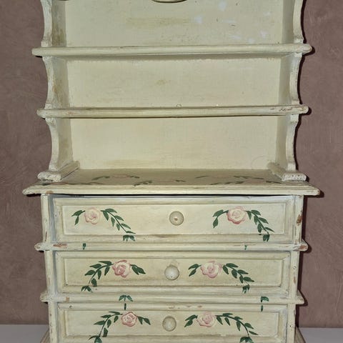 Søt liten smykkeskrin/miniatur komode av malt tre. 4 skuffer dekorert med små trehjerter. Størrelsen (B)18,5 x (H)15,5 x (D)9 cm