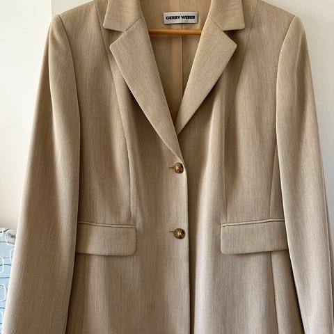 Pen grønn drakt str 42, livvidde 82 cm, skjørtelengde 63 cm. Skjørtet har gåfolde bak og jakke og skjørt er helforet. Dansk kvalitet, lite brukt. Kr 350.