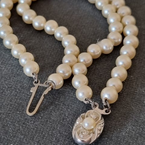 Vakkert halskjede med syntetiske perler og anheng med dekor på selges- Lite brukt