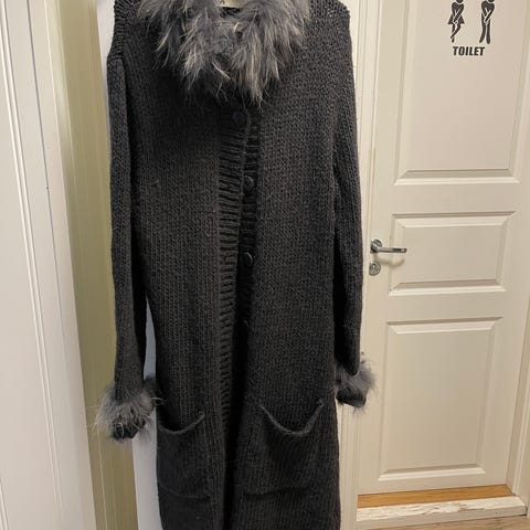 Minnie the Strongest damejakke i størrelse S, farge grå. Jakken har knapper foran og detaljer med ekte pels på hetten og ermene. Materialet er strikket, og plagget er designet for kvinner.
