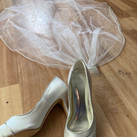 Nydelig brudekjole kjøpt på Oksnes brudesalong i Ålesund. Selges med tungt hjerte da jeg ikke har plass til å beholde den. Kjolen er i størrelse 14, jeg brukte str. M i klær da jeg giftet meg- så kjolen er nok litt liten i størrelsen. Kjolen er tilpasset meg i midjen og brystpartiet, og lengden på skulderstroppene er justert. Det er sydd på et belte i midjen. Dette kan fint tilpasses til deg. Den passer nok best til noen med litt stor cupstørrelse, men fungerte fint til meg med en c også selv om litt romslig. Jeg er ca. 171 cm høy og brukte sko med 5 cm hel. Kjolen kan legges opp. Den er ikke renset