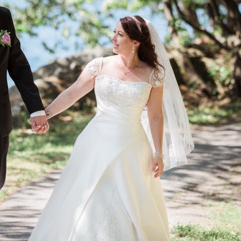 Brudekjolen er modell 1916 fra Agape og kostet ca 13000 kr med slør og underskjørt.