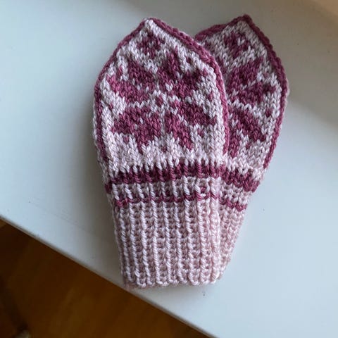 Hjemmestrikket av en svært strikkekyndig dame. Noe etter oppskrift fra Nøstebarn og Mormor.nu.