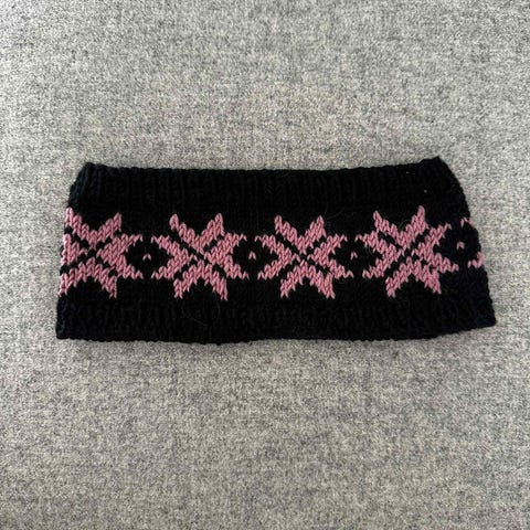 Pannebånd i fanamønster.Raumagarn TUMI 50% ull 50% alpakka. Gammelrosa med brunt mønster.53 cm rundt,10,5 cm bredt! Kan sende.