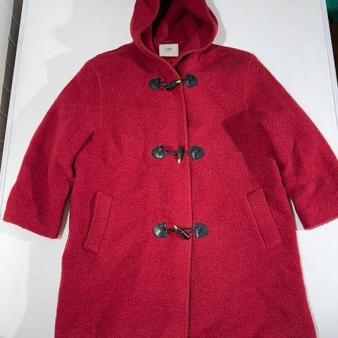 Selger en ny halvlang jakke / kort kåpe fra H&M i str 44. Den er mørkeblå og er av bl.a 55 % ull. Dette er en klassisk "Dyffelcoat" som kan kneppes enten mot venstre eller høyre med "gullknapper" Lommene er fortsatt "sydd" igjen, da den aldri har vært i bruk. Prislappen henger fortsatt på. Se bilder for nærmere detaljer.