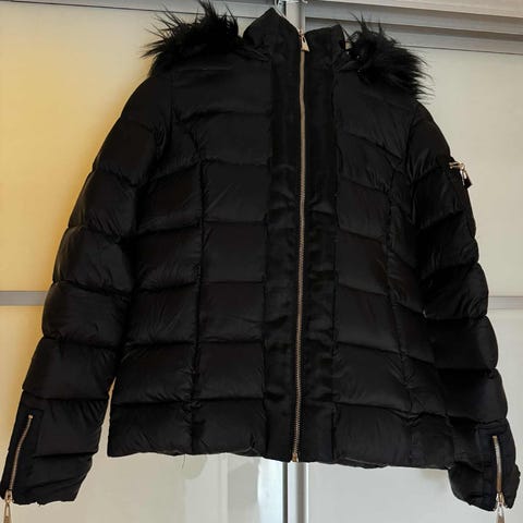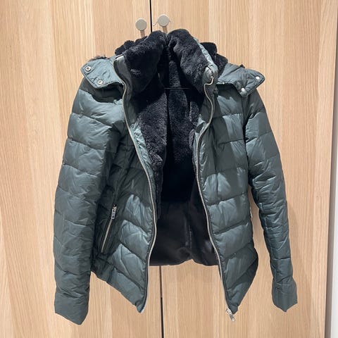 Damejakker, vattert, størrelse 36. Farge blå med skinn på krage