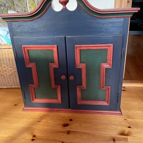 Veggskap i nyklassisistisk stil selges. størrelse: høyde 79, bredde bak 85, bredde foran 64 og dybde 20 cm.