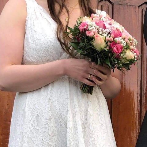 Brukt en gang i 2013 og vært på rens etter bruk.Nypris var ca 12000kr. Underskjørt medfølger om ønskelig.