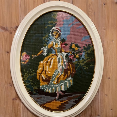 Stort brodert strameibilde med flott ramme og lys