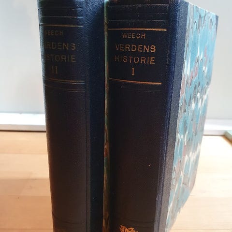 W. N. Weech (red.): Verdens historie I og II (2 bind), Dreyers Forlag, Oslo 1949. Uten omslag. Betydelig slitasje og noen rifter på permer. Sprekkdannelser øvre del av rygg på bind I. Bruksspor i en ellers OK materie.