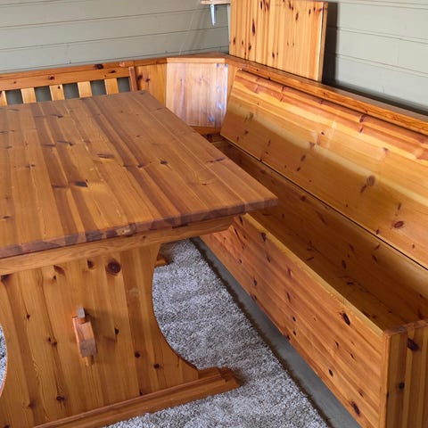 Her kan du ha middagsselskap i ene enden, mens barna sitter med brettspill i andre. Genialt møbel for storfamilien på hytta.