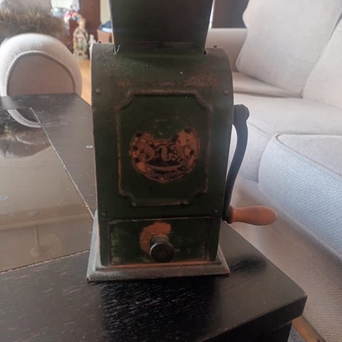 Gammel kaffekvern høyde inkl.sveiv 16 cm Selges 450,- kan sende med posten.