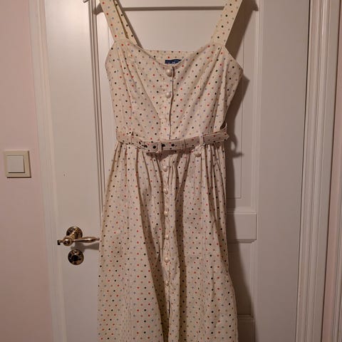 Selges den fine mørke blå polka dot kjolen i retro stil. Kjempefin kjole med flotte hvite detaljer og kjempebra kvalitet. Størrelse 38. Nesten ubrukt