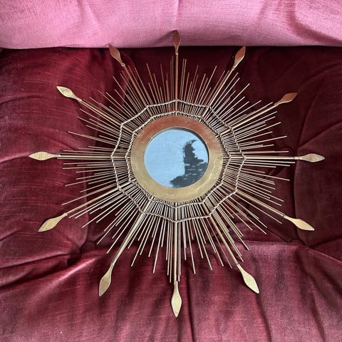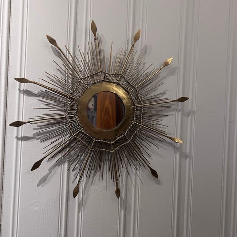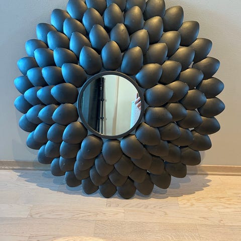 Selger ett nydelig solspeil. Det er noen skår i de små speilene, selges derfor til en veldig redusert pris. Ca.95 cm i diameter. Nypris 1900 kr. Selges for 500 kr. Hentes i Asker.