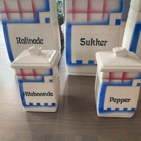 Diverse spiserikrukker selges. Kaffe, gryn og sukker selges. Se forøvrig pris under bildene. Jeg pakker godt og sender gjerne med til kr. 70,- inkl. sporing og forsikring