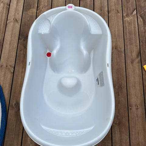 Hvit badestol til baby kr 50,-. Kjøpt på Barnevognhuset.