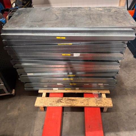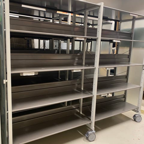 2 Juestertbar hyller som har god kvalitet høyde 183 cm dybde 53 cm og bredde ca 93 x 2 = 186 cm som juesteres inn til 5 cm på høyden 8 hylleplater bredde å 90 og dybde 43,5 cm og 10 hylleplater med bredde 90 cm og dybde 33,5 cm. Bredde til 2 hyller 186 cm og høyde 183 cm