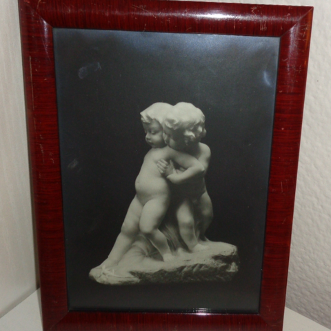 Koselig bilde av hundemamma med valper i 70-tallets sponplate stil.