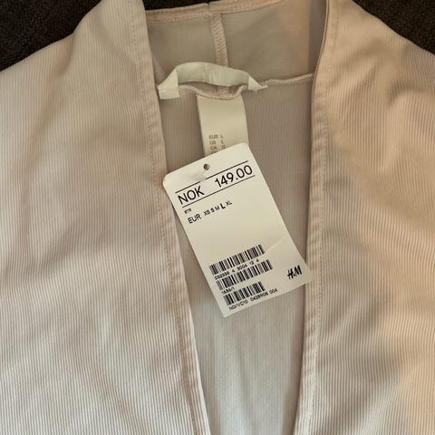 Den er str. 40, lys beige, med pyntebånd med litt gyldne stener rundt halsen. Lett og behagelig.