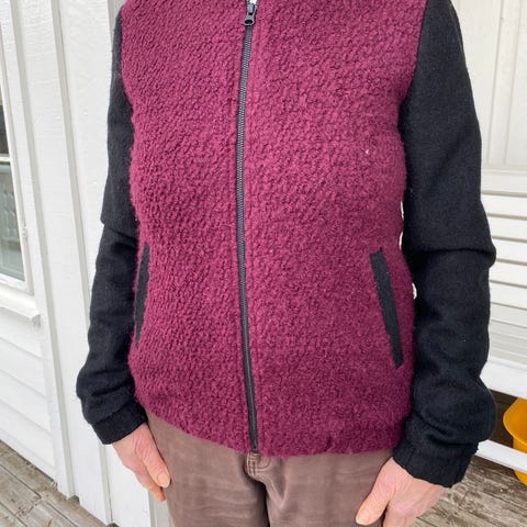 • nydelig mellomblå farge (enda finere og mye "renere" i fargen enn på bildene) m/svarte knapper, skinnkant nedover foran + skinnbelte