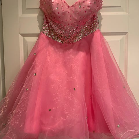 1-2 ganger i min brors forlovelse og en annen fest. Den er renset og selges grunnet flytting til leilighet med lite plass/rom. Ny pris for kjolen er over 1000 NOK. Kjolen er veldig elegant og passer til julebord/bryllup konfirmasjon osv. Den har innebygd BH og korset.