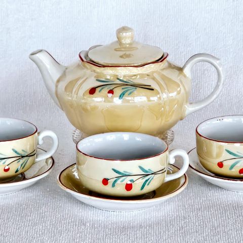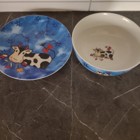 Selger div. Barneservice, kopp, krus, flat og dyp tallerken. Alle deler er pent brukt, uten skår og nagg. Merke Kahla.
